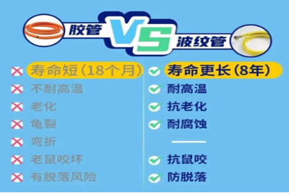 使用合格的燃气具和配件,《城镇燃气工程项目规范》GB55009-2021第6.1.7条规定软管的使用年限不应低于燃具的判废年限。传统燃气橡胶软管使用缺陷较多,易老化、易脱落、老鼠爱咬、使用寿命短,如有破损,极易发生燃气事故。燃气橡胶软管的使用寿命只有18个月,不符合规定应被淘汰,必须使用安全性高、寿命长的燃气专属包覆软管或不锈钢波纹软管,并定期进行检查。