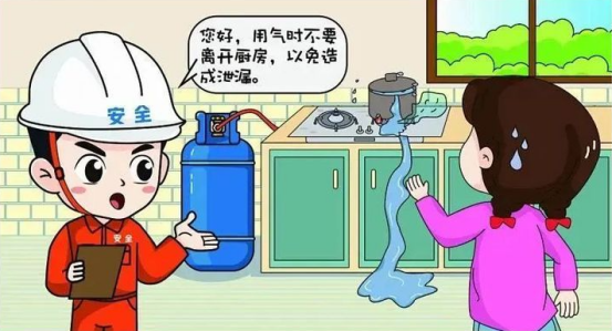 3、使用燃气时要有人看守。灶具使用中要有人照看,以防止火苗被溢出的汤水或风扑灭,造成燃气泄漏,使用燃气后一定要及时关闭燃气阀门。特别是在暑假期间,上班出门前一定仔细检查一遍燃气具,叮嘱小孩不要玩燃气具。